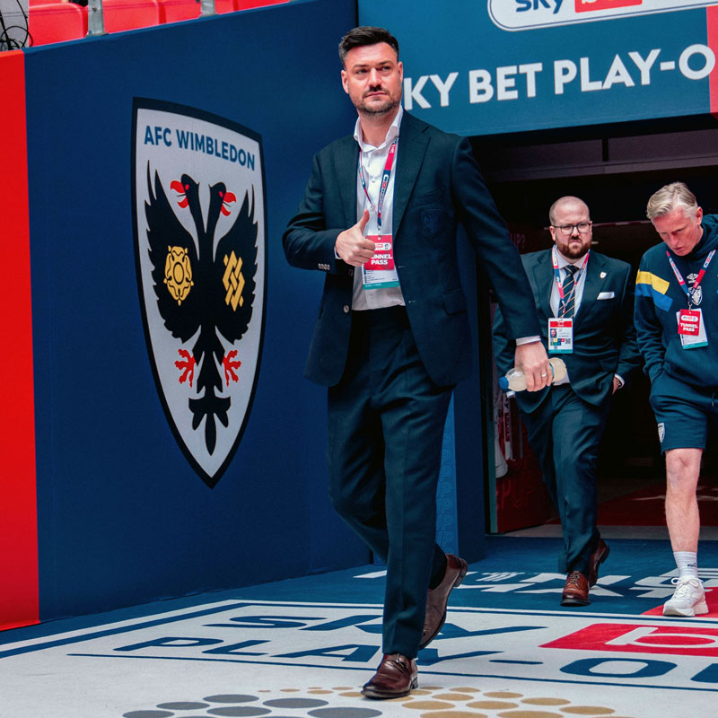Johnnie, known for his traditionally sportier touchline attire, waited for the right moment to unveil his new look. That moment came in May 2025, as AFC Wimbledon defied the odds to reach the League Two Play-Off Final at Wembley Stadium. With promotion to League One on the line, Johnnie led his team onto the pitch looking every bit the part in his made-to-measure Brittany suit and shirt.